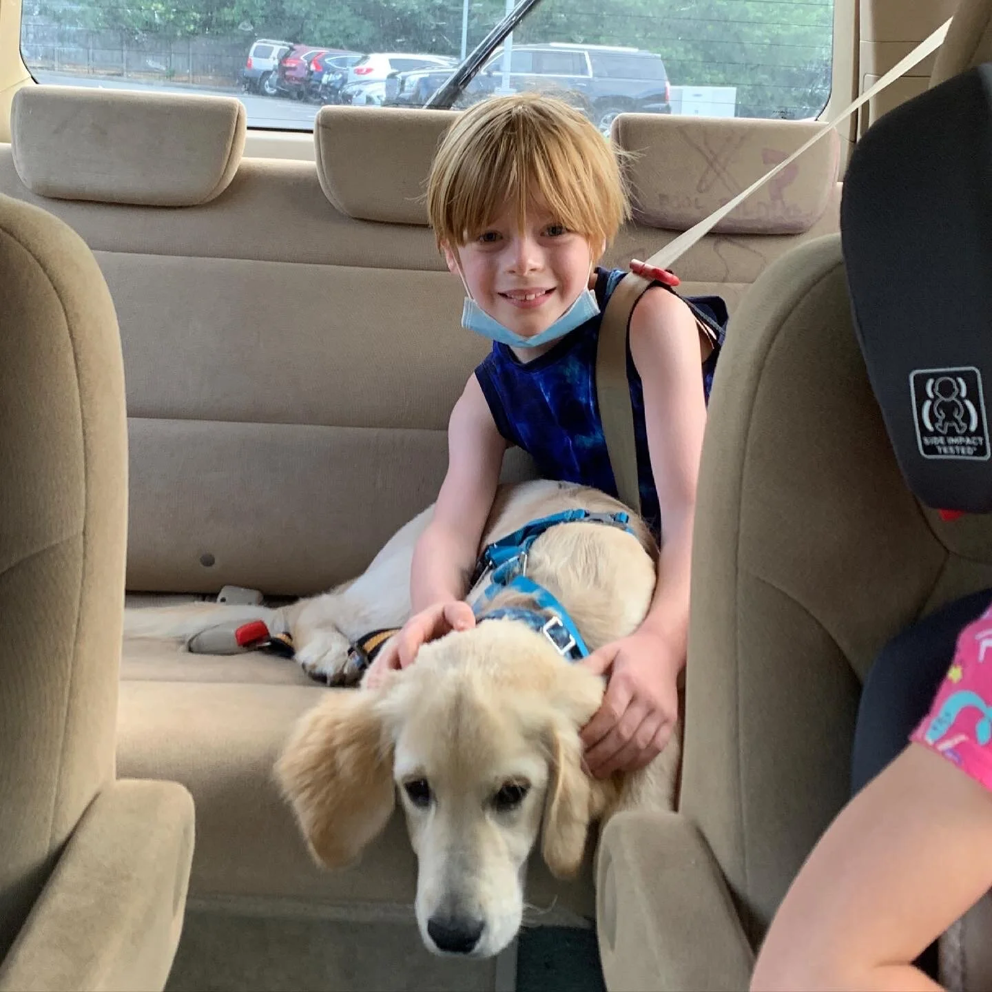 Meeting our early fundraising goals allowed us to add Archer to our home in June, 2021 💙💙💙. Archer is a Golden Retriever pup bred and selected specifically for service work. He completed 2 months of foundational training prior to coming home to us. He still has several phases of more advanced training to complete before becoming Rowan’s service dog.