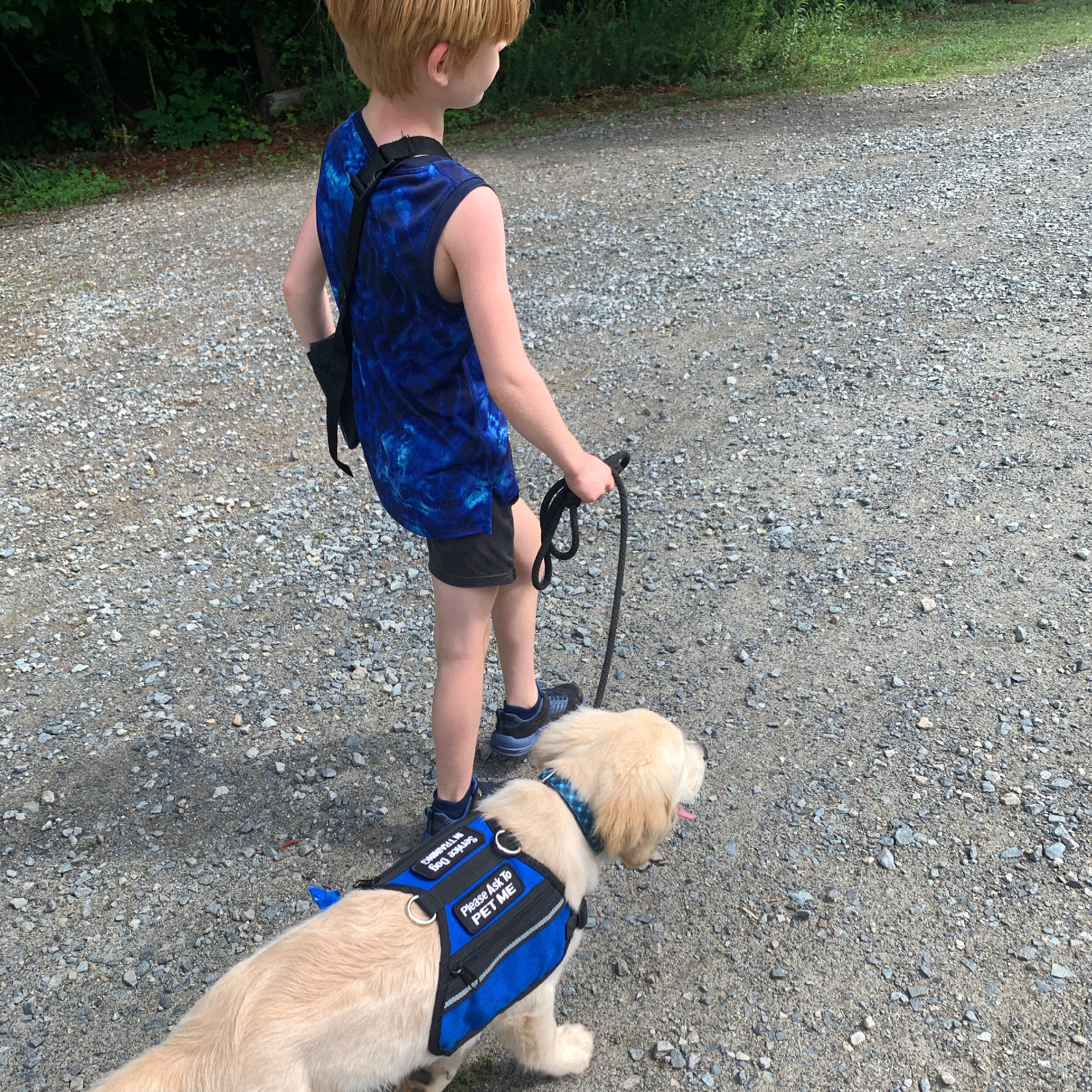give Rowan a physical anchor in parking lots, crowds, stores where overstimulation can lead to unsafe hyperactivity (no tethering, Rowan would hold the dog’s leash or harness)